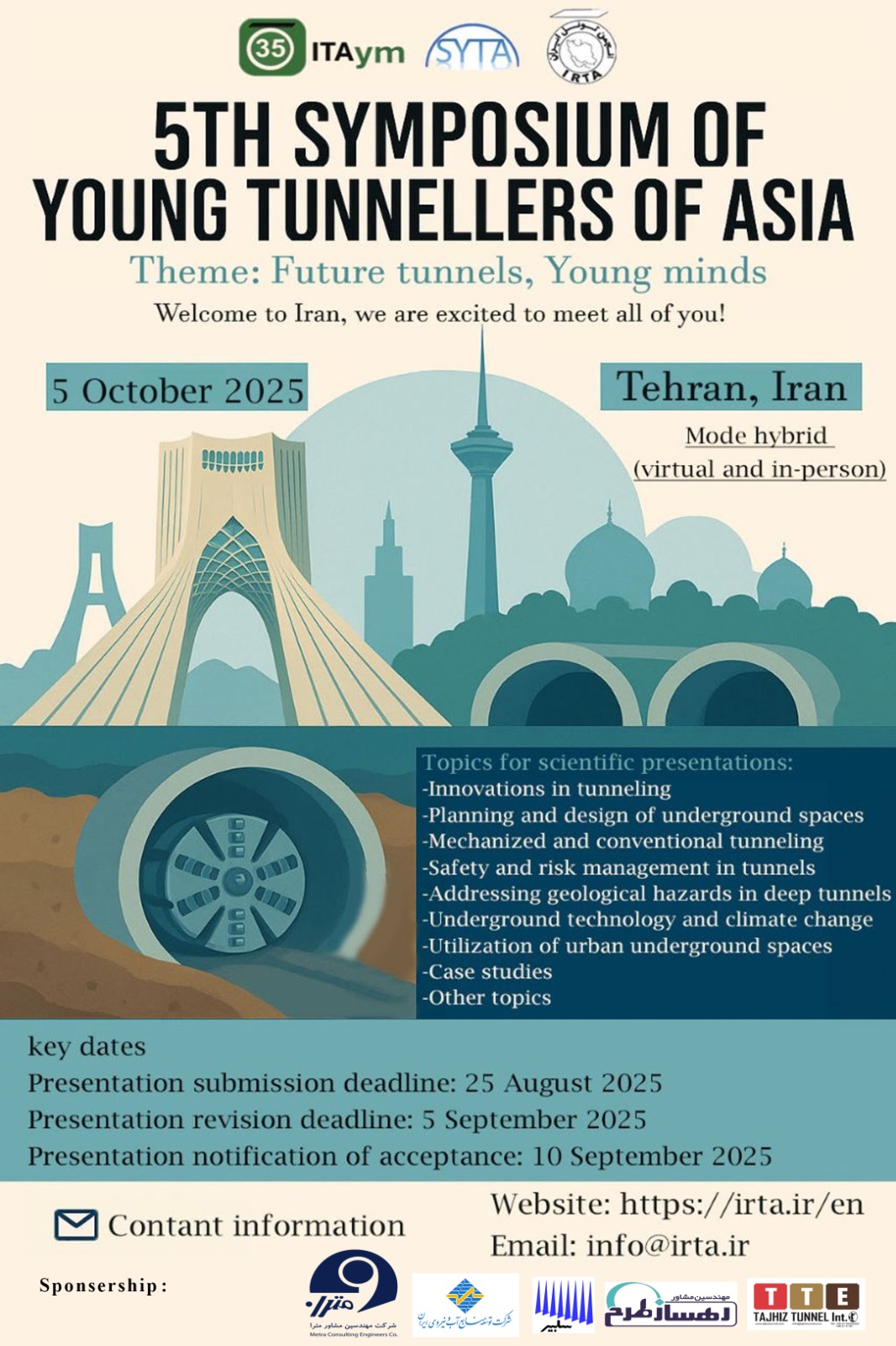 به نقل از روابط عمومی شرکت مترا، پنجمین سمپوزیوم بینالمللی تونلسازان جوان آسیا (SYTA 2025) با شعار الهامبخش «Future Tunnels, Young Minds» روز ۱۳ مهرماه ۱۴۰۴ (۵ اکتبر ۲۰۲۵) در سالن امام رضا (ع) دانشگاه علم و صنعت ایران برگزار شد. این رویداد که به میزبانی انجمن تونل ایران (IRTA) و با حضور اعضای جوان انجمن بینالمللی تونل برپا شد، بستری پویا برای تبادل دانش و ایدههای نوآورانه در حوزه مهندسی تونل و فضاهای زیرزمینی فراهم کرد.